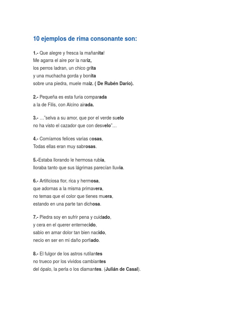 Es decir un fonema de un primer verso rima o combina con un fonema del verso siguiente. En este caso las palabras que tienen rimas asonantes con chiquito pueden pasar de las 1000. La rima es uno de los elementos más importantes en la poesía ya que ayuda en la estética del poema para darle más musicalidad y un efecto acústico que armoniza con el. Encuentra respuesta a tu tarea ahora en Tareas Gratis. 10 ejemplos de rimas asonantes y 10 rimas consonantes. EjemploAbro plancho ajo rato.